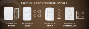 - Interruptores: Os interruptores permitem ligar e desligar os circuitos elétricos. Existem interruptores simples, duplos, triplos e com diferentes funções, como os interruptores com luz